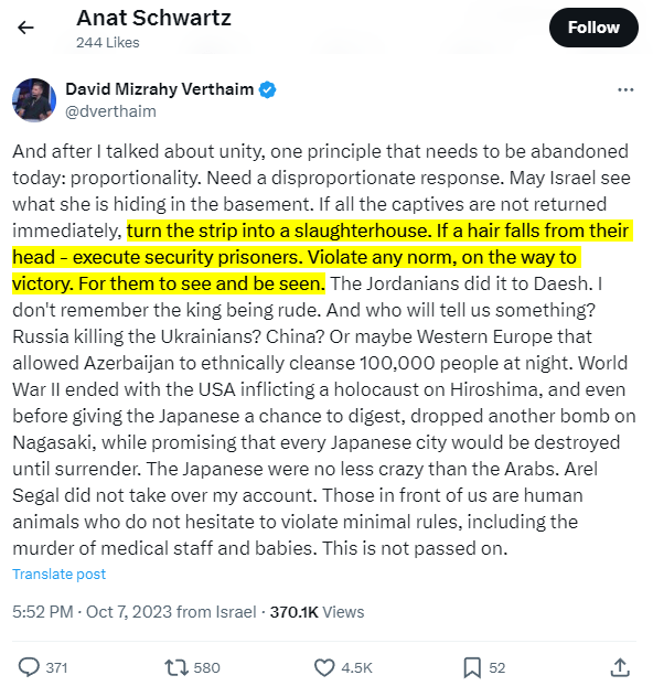 As mentioned in the video above, there was a major controversy regarding one of the writers of the now infamous New York Times article alleging widespread sexual violence by Hamas. It turns out that Anat Schwartz previously served in the Israeli military’s intelligence service. And she also liked a tweet which called for the Gaza Strip to be turned into a “slaughterhouse”: