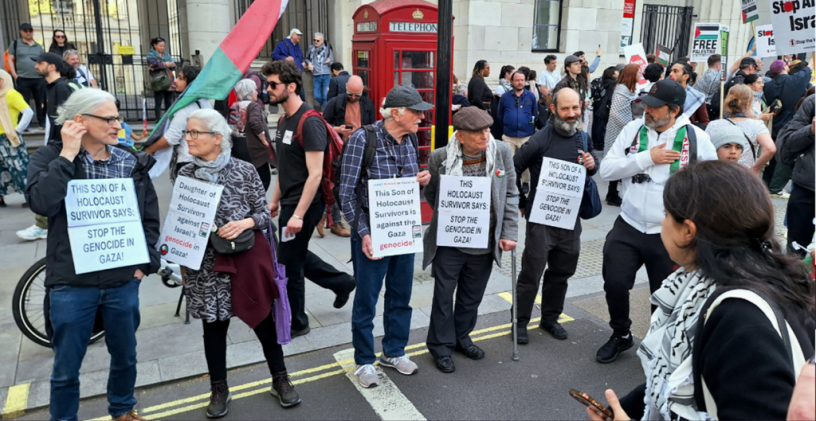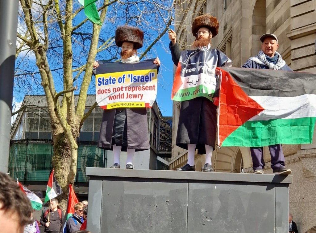 These pro-Israel demonstrators claim that Jews do not feel safe walking in central London every Saturday. But the present writer can confirm that thousands of openly Jewish people attend the marches every week and face no discrimination. Please see the short video of Jews on one of these protests below: